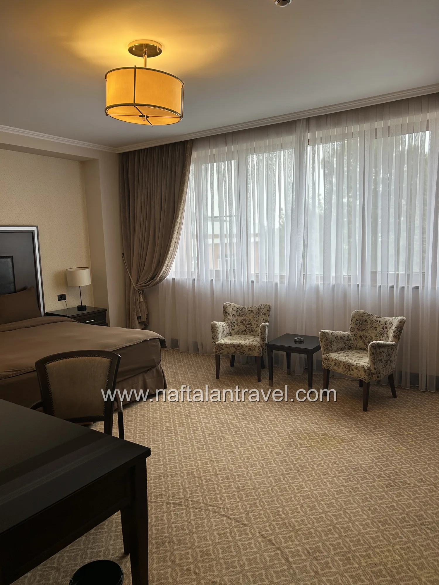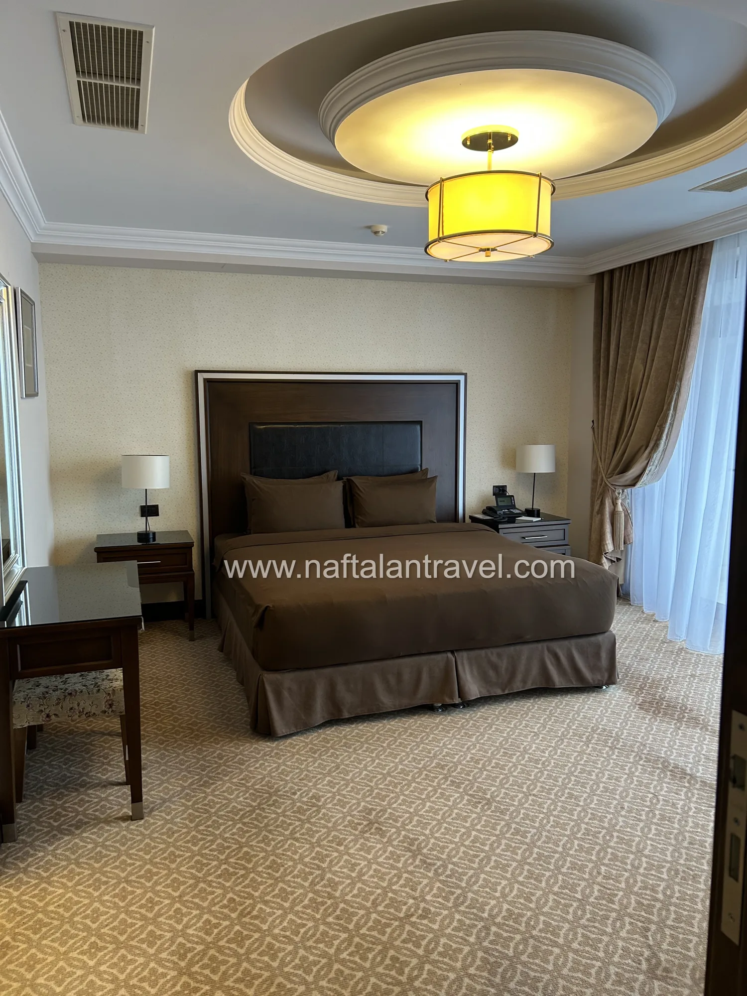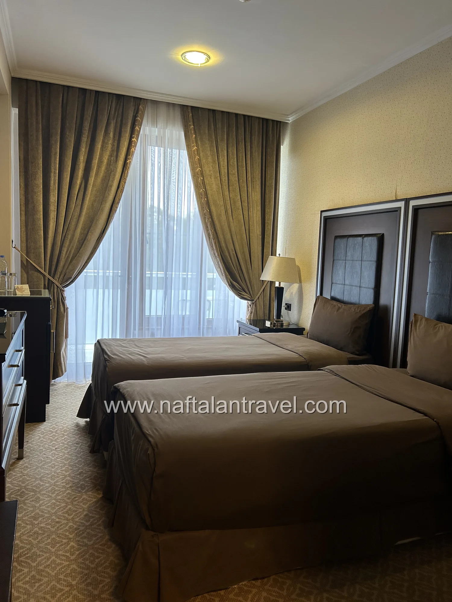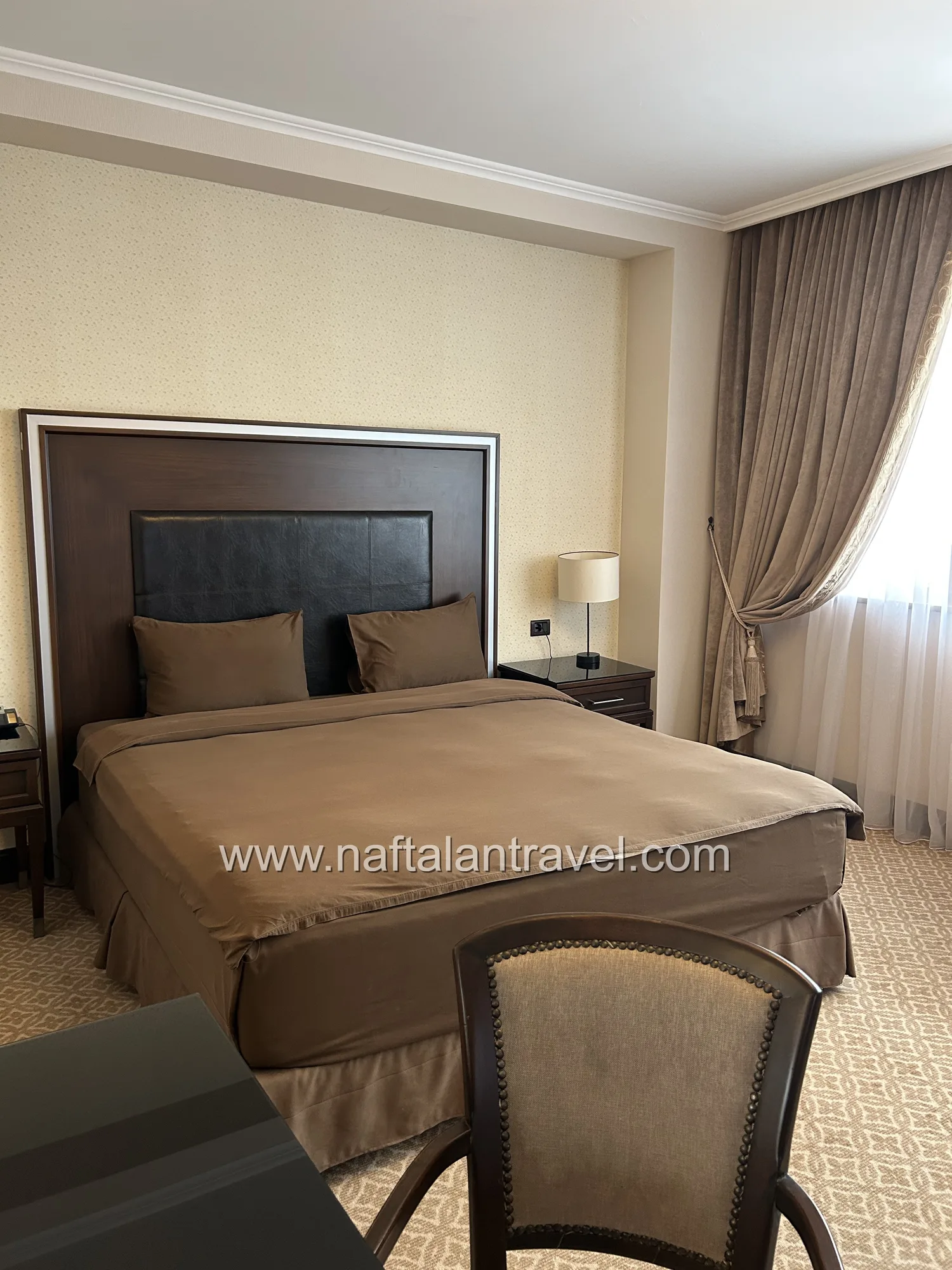 Просторный номер категории Deluxe площадью около 38 м² создан для гостей, ценящих уют и современный стиль. Элегантный интерьер, функциональная мебель и продуманная планировка обеспечивают максимум удобства во время отдыха или деловой поездки в Нафталан.