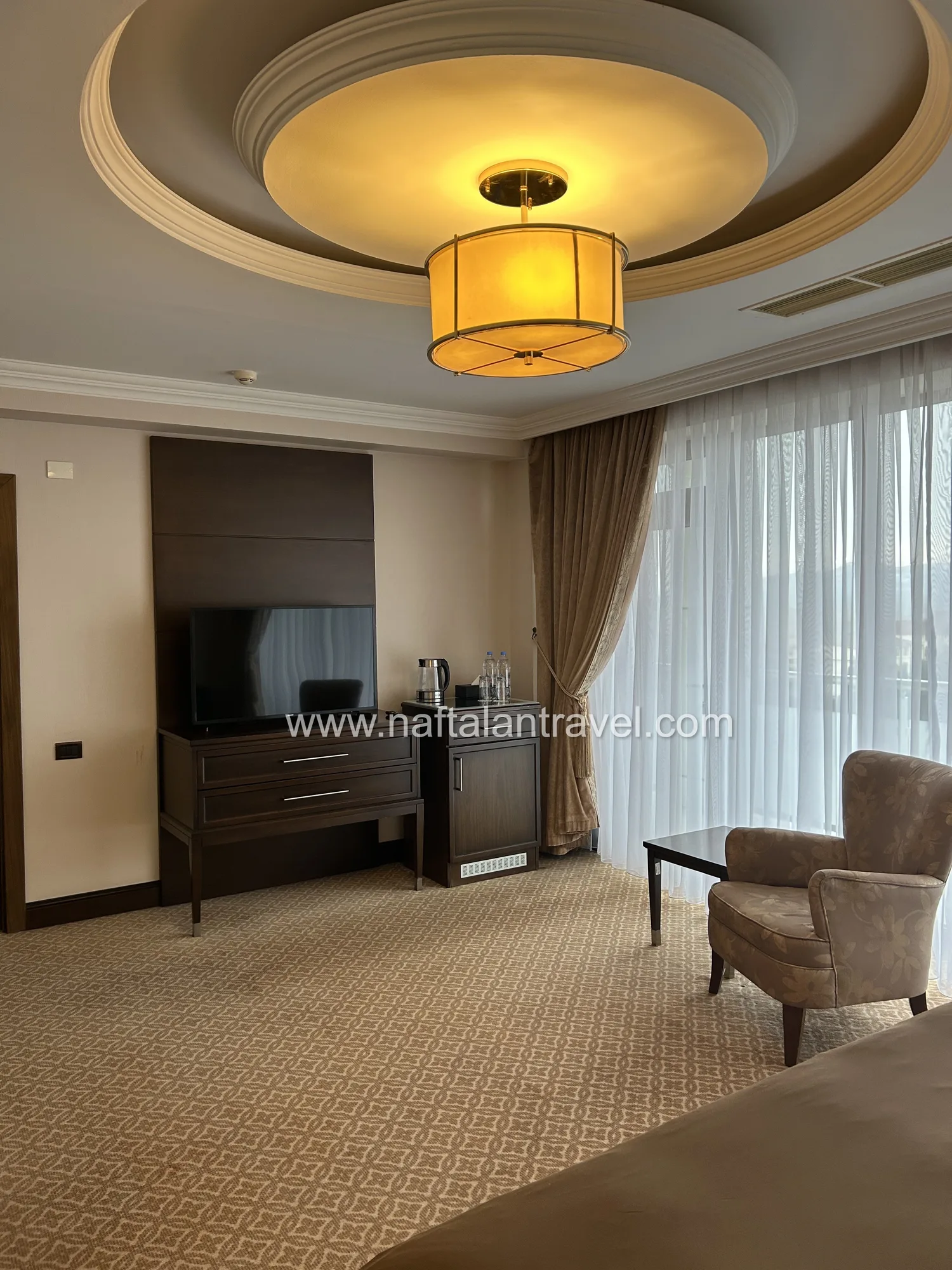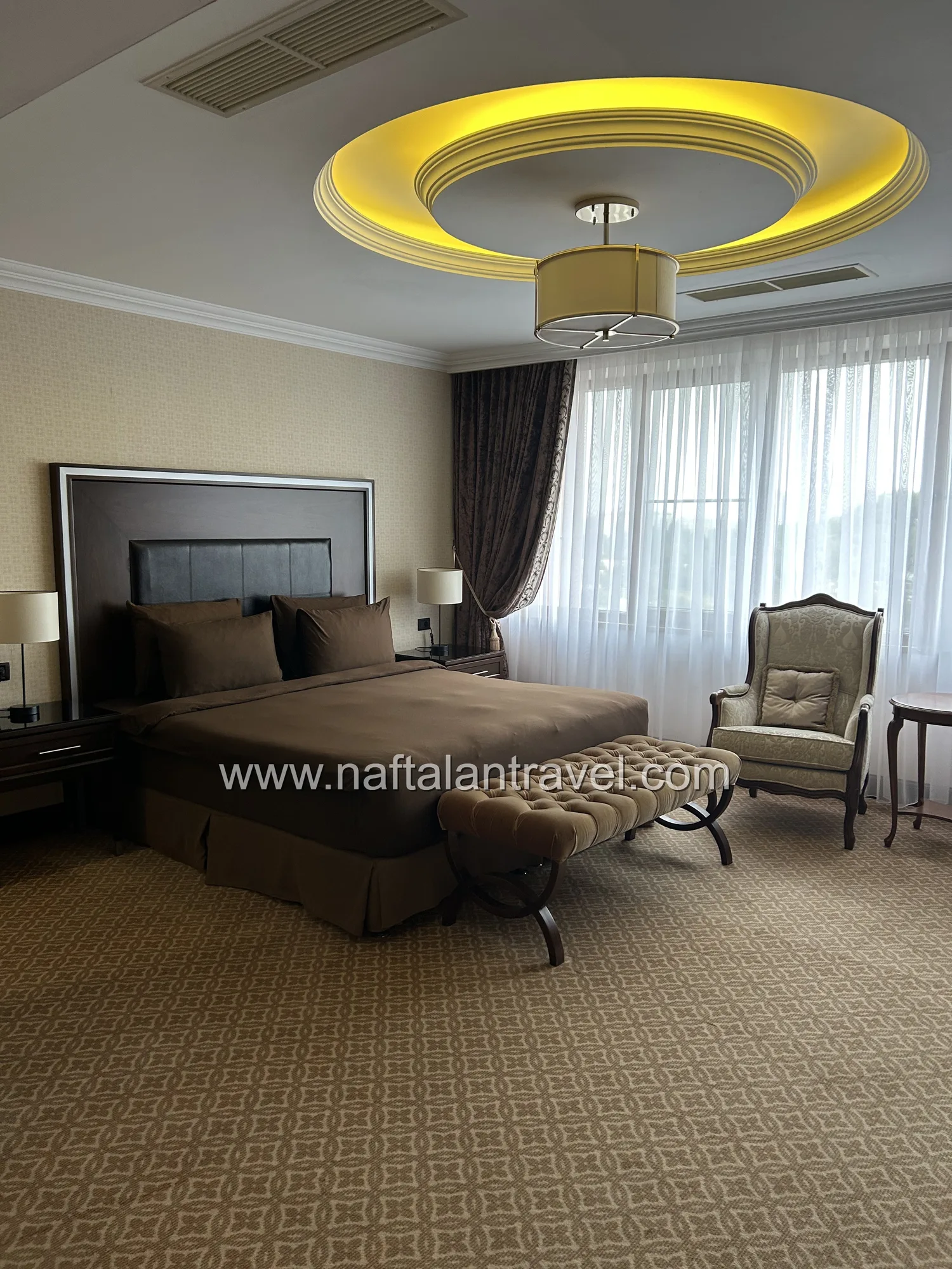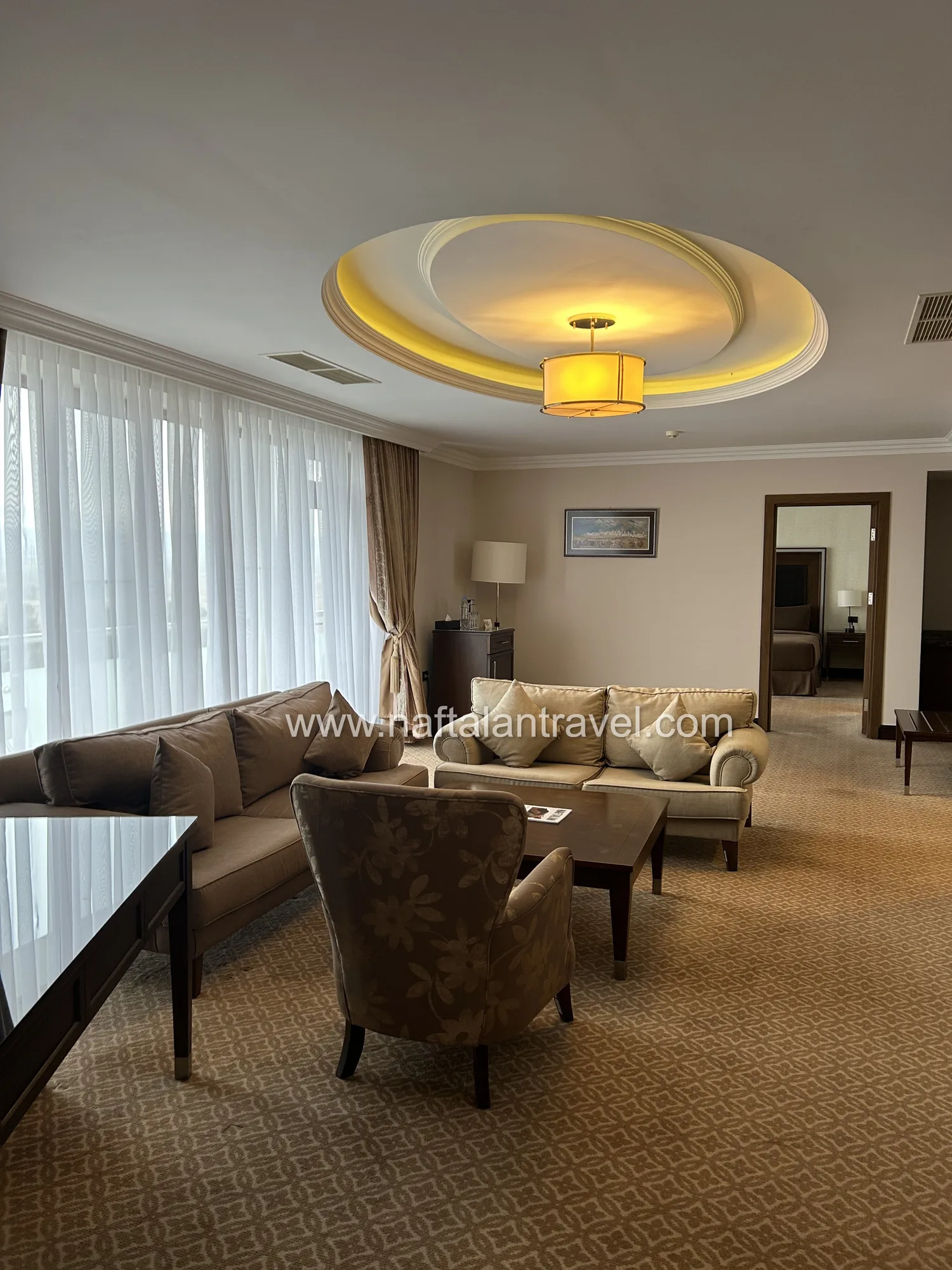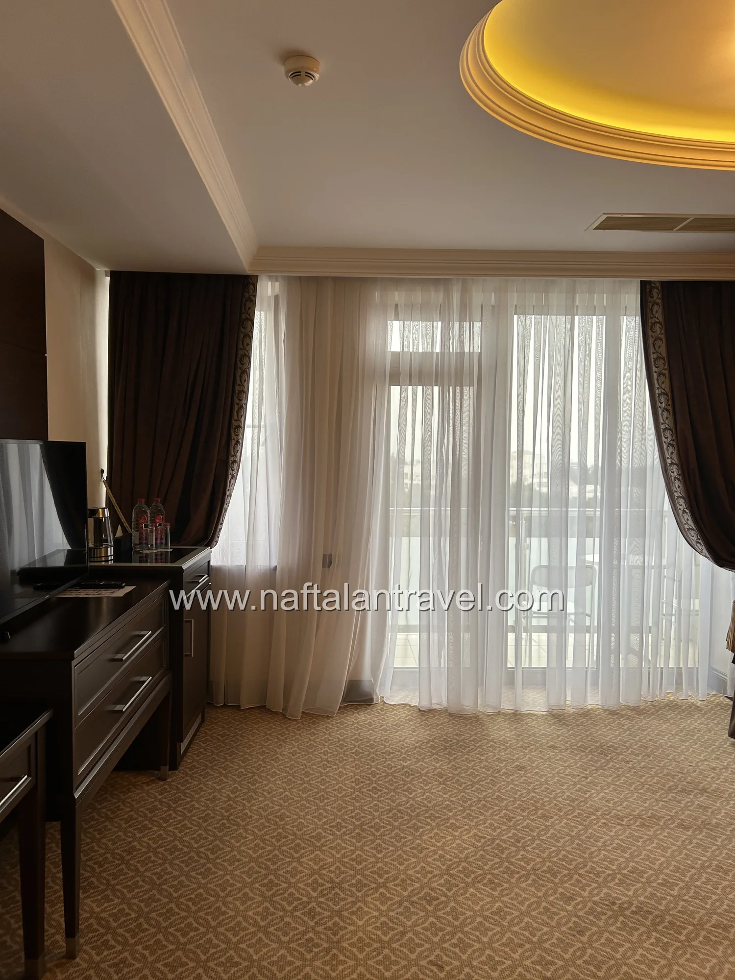 Просторный номер категории Deluxe площадью около 38 м² создан для гостей, ценящих уют и современный стиль. Элегантный интерьер, функциональная мебель и продуманная планировка обеспечивают максимум удобства во время отдыха или деловой поездки в Нафталан.