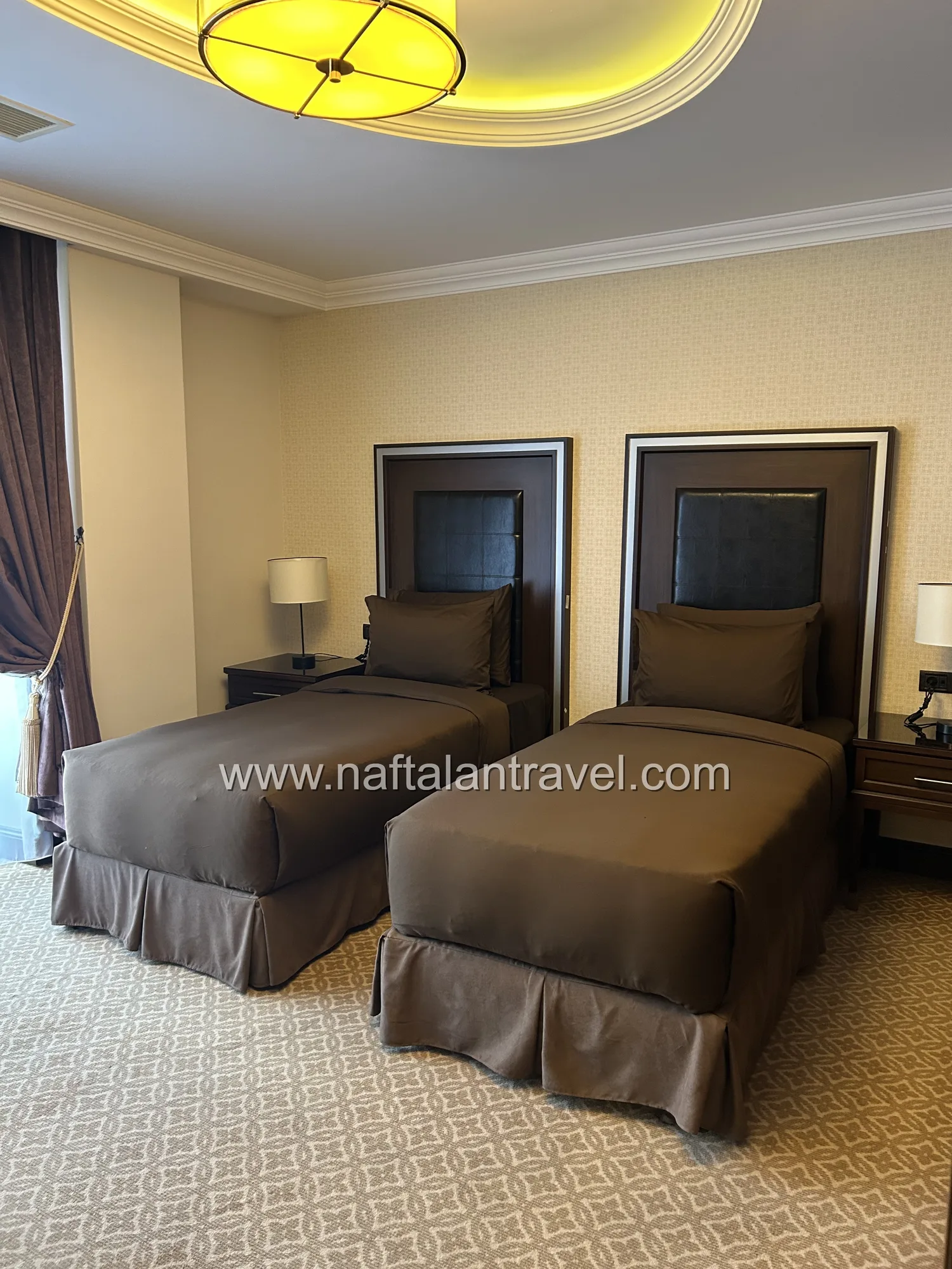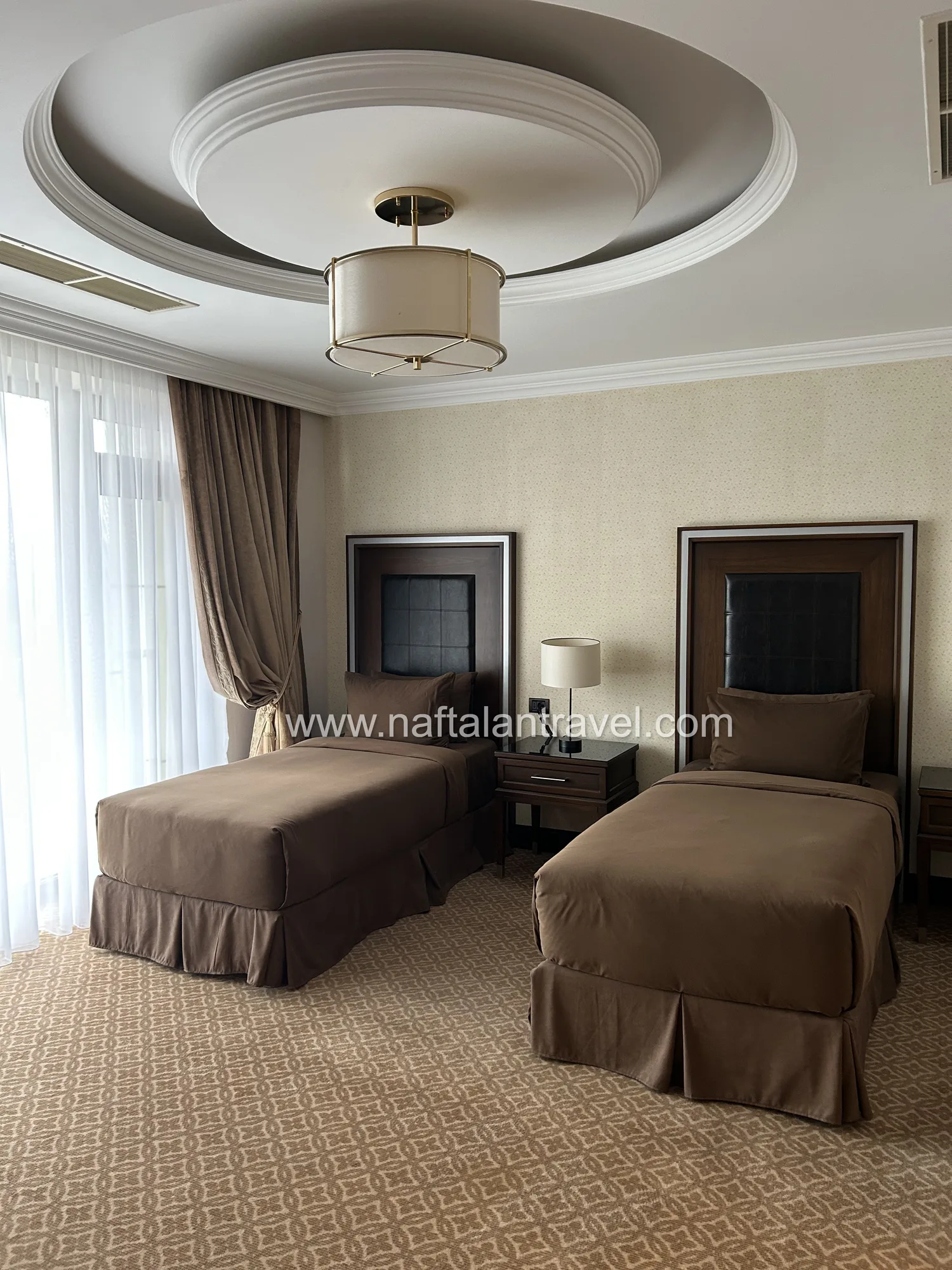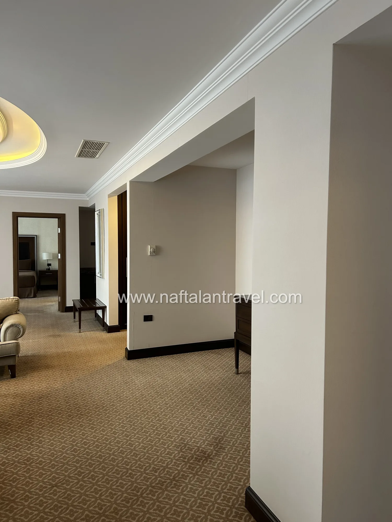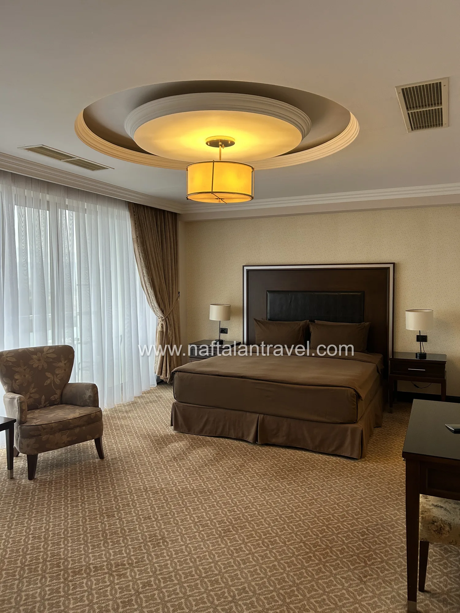 Просторный номер категории Deluxe площадью около 38 м² создан для гостей, ценящих уют и современный стиль. Элегантный интерьер, функциональная мебель и продуманная планировка обеспечивают максимум удобства во время отдыха или деловой поездки в Нафталан.