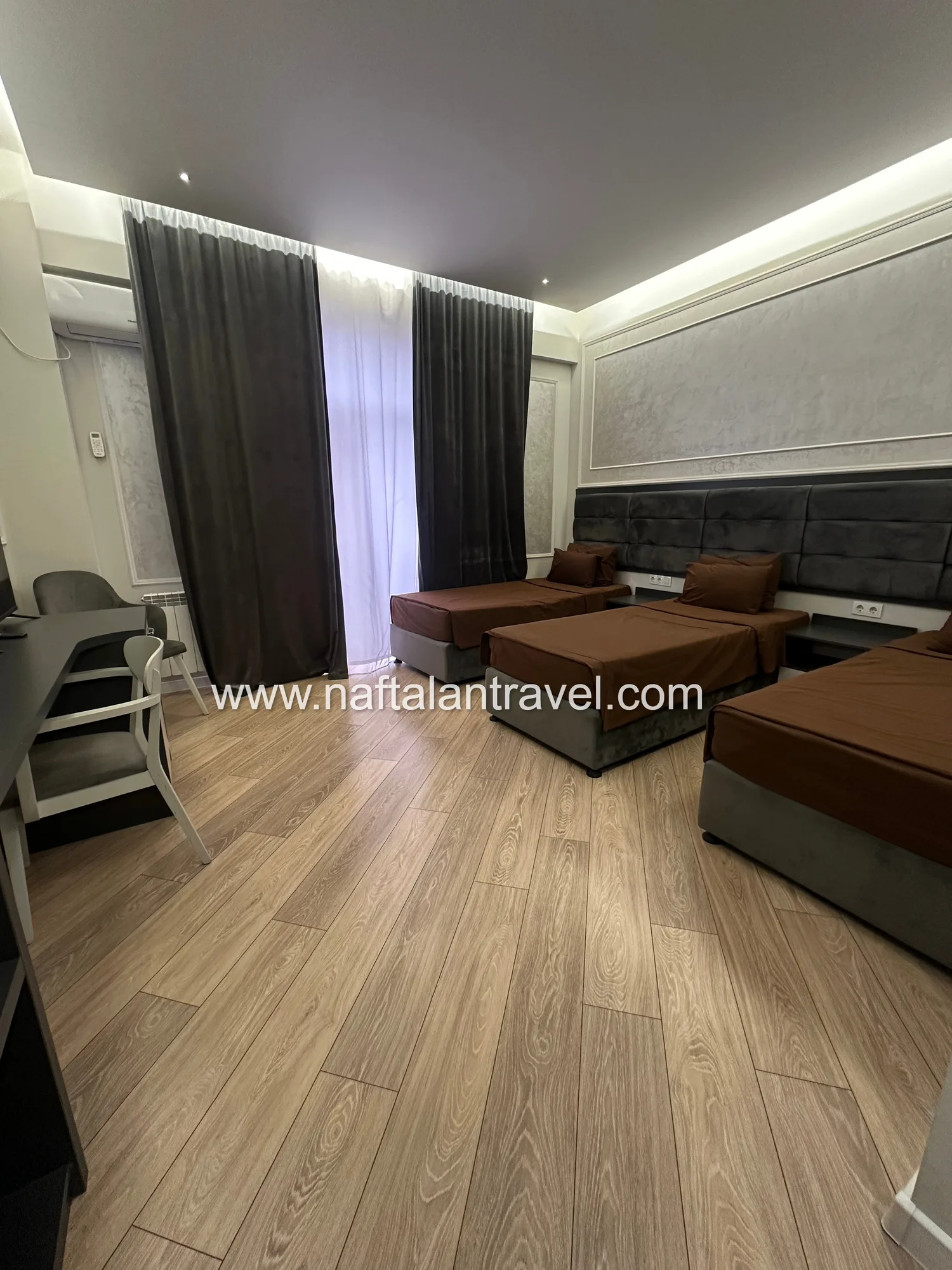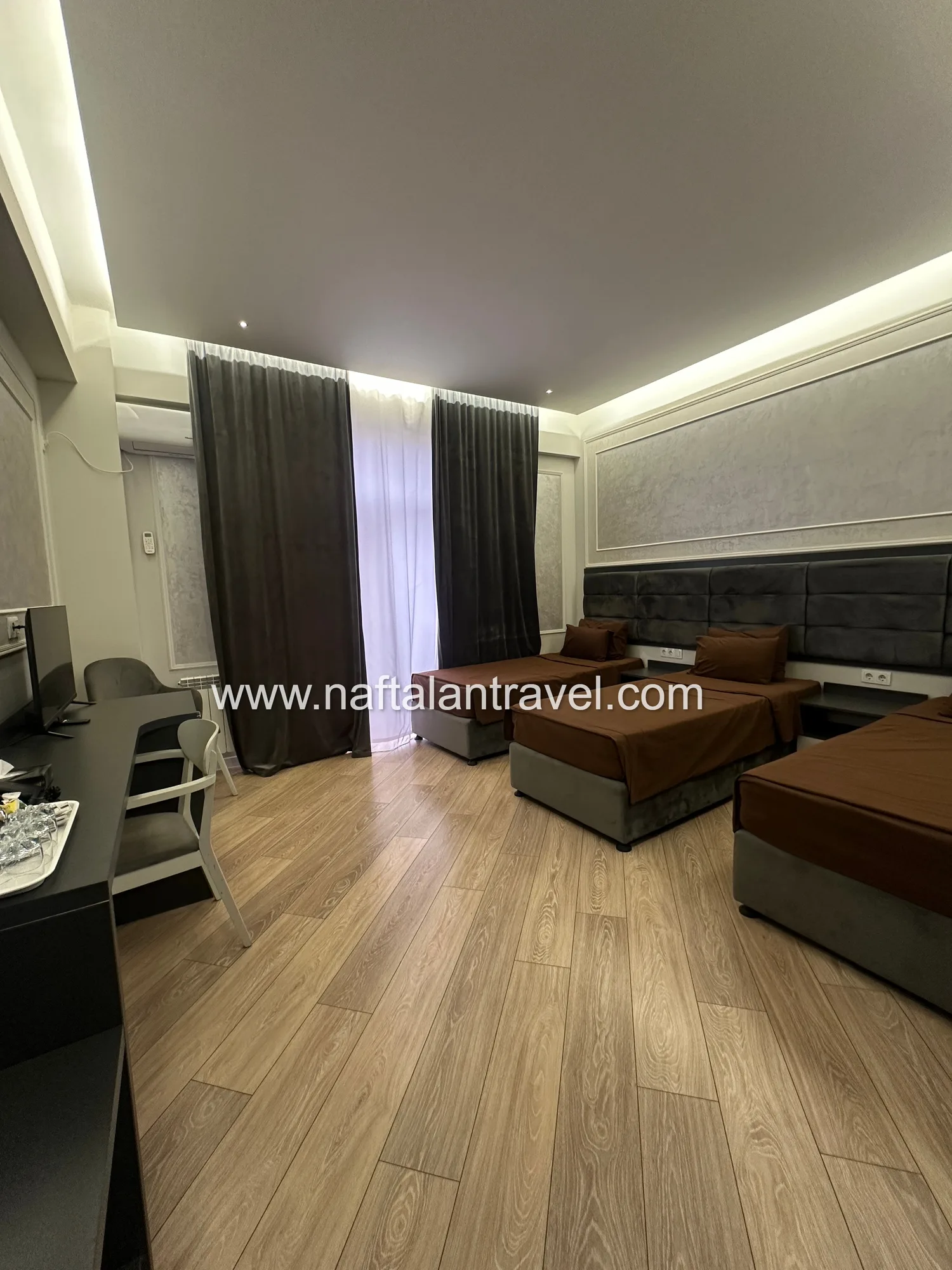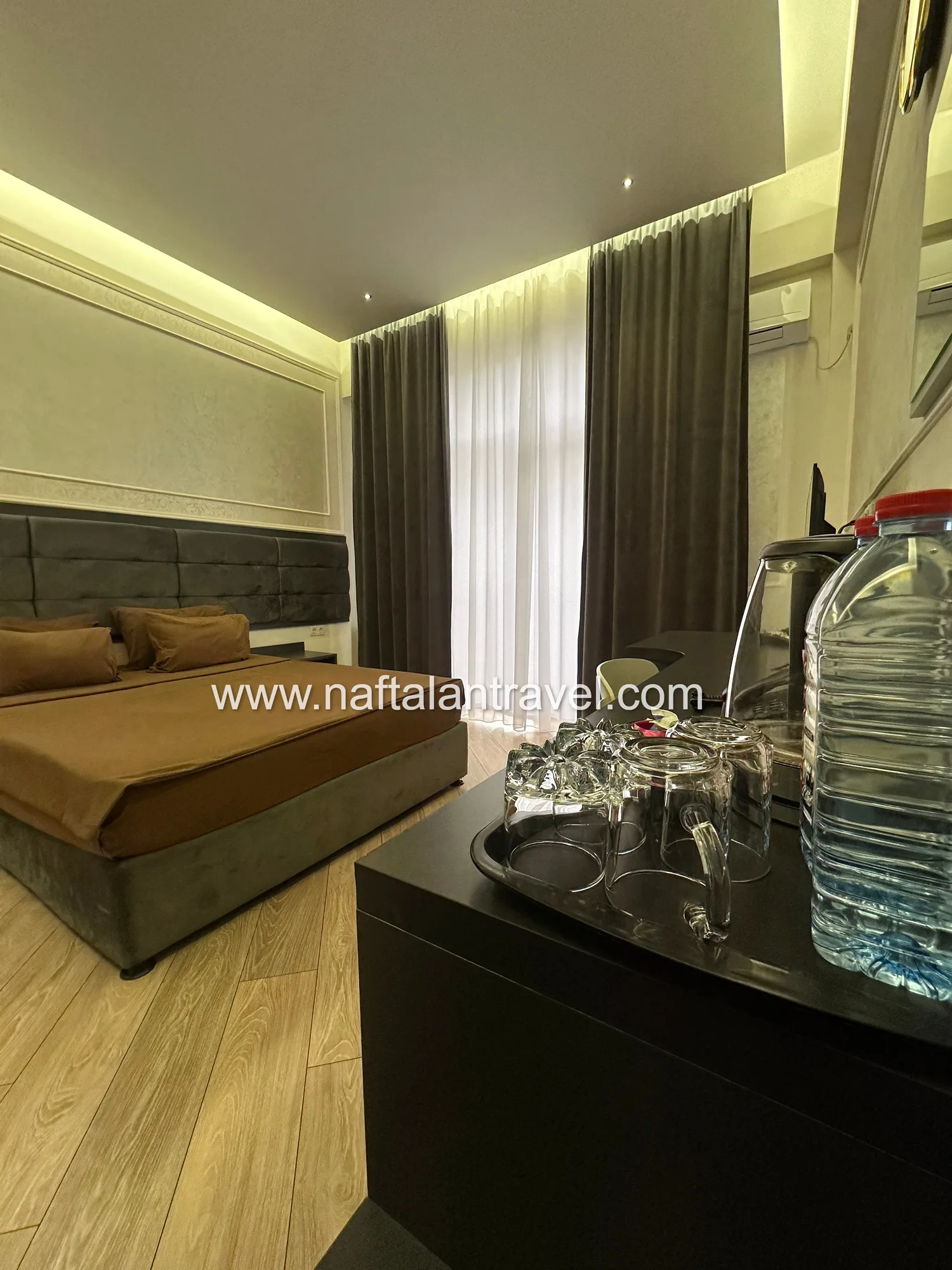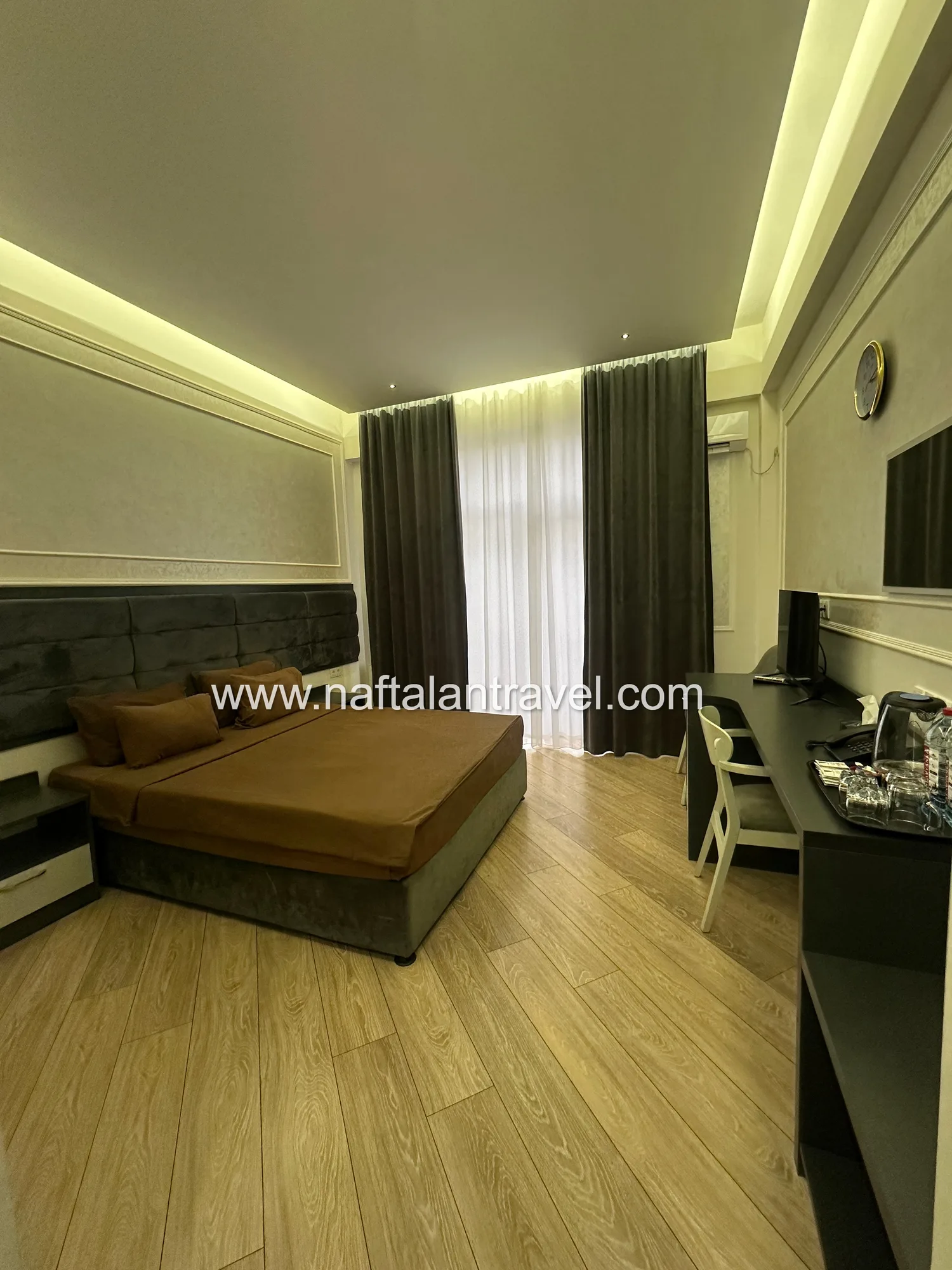 Современный интерьер, спокойные тона и практичная меблировка делают номер идеальным вариантом для отдыха, восстановления и длительного пребывания в оздоровительной атмосфере Нафталана.