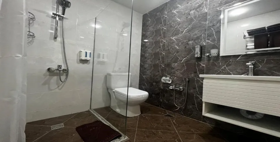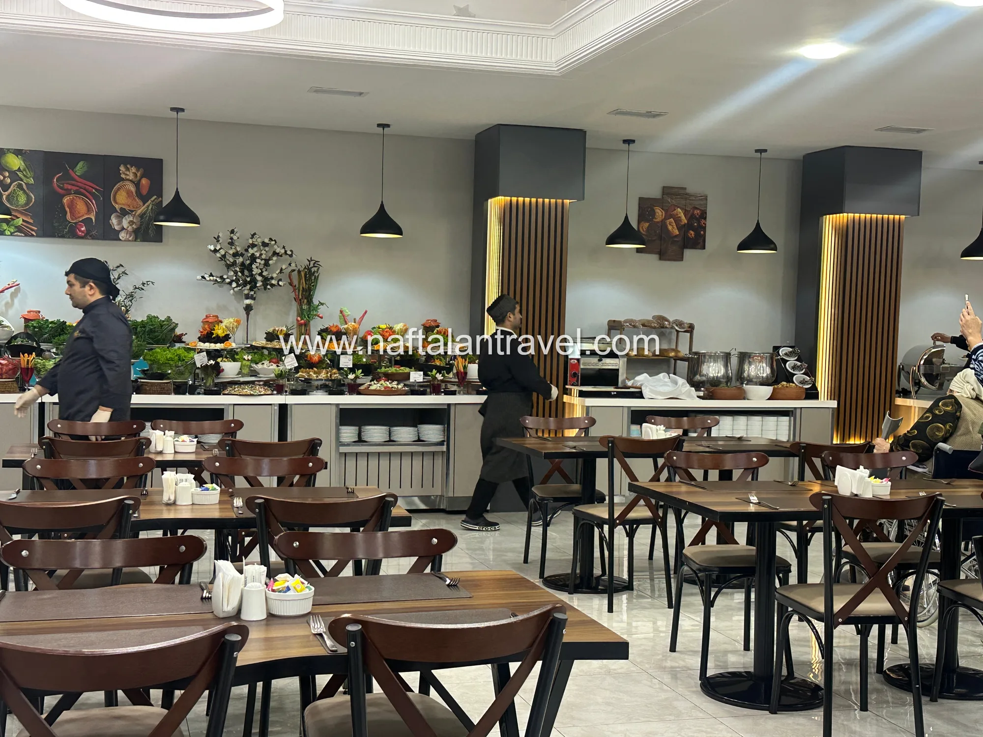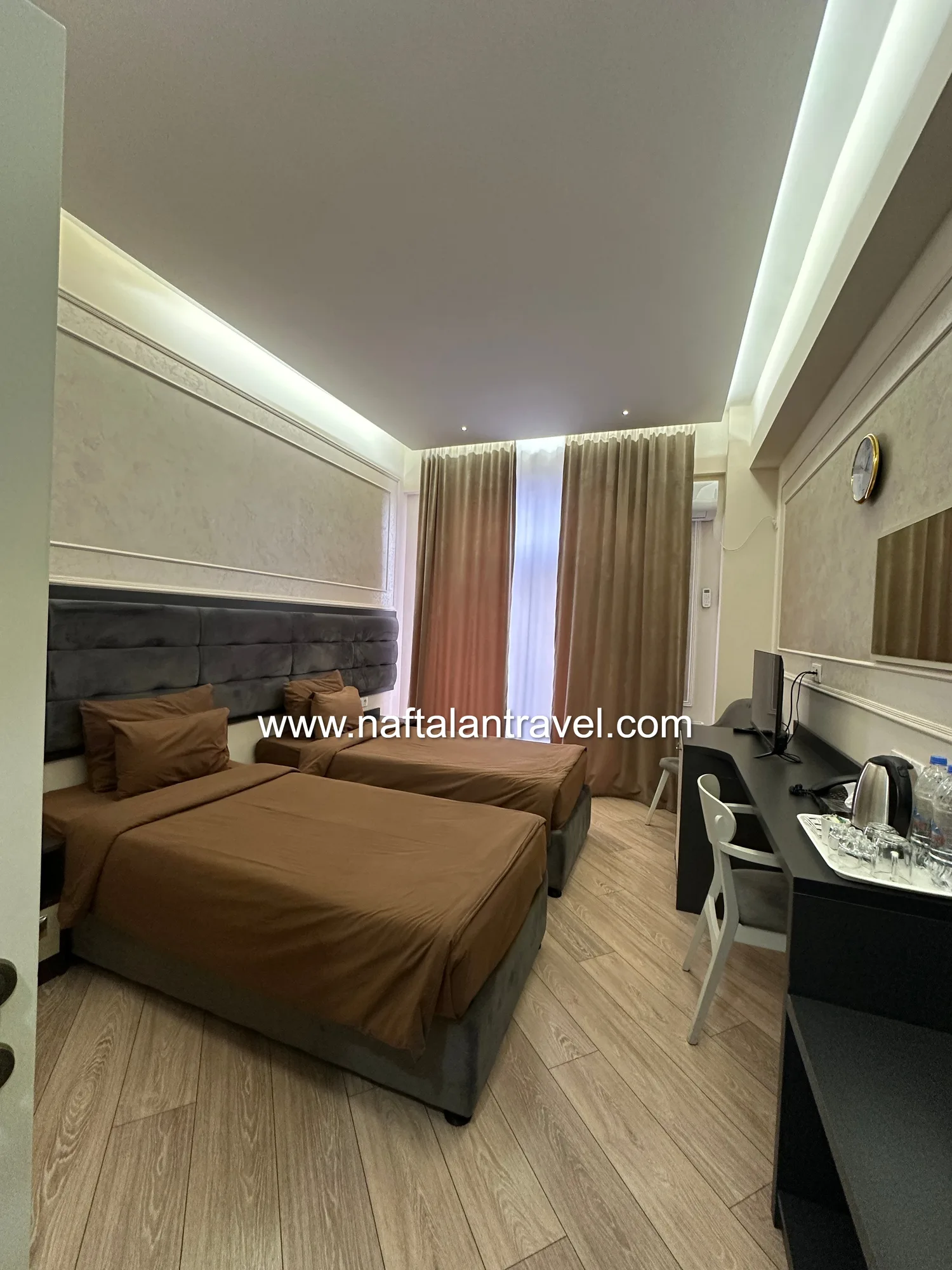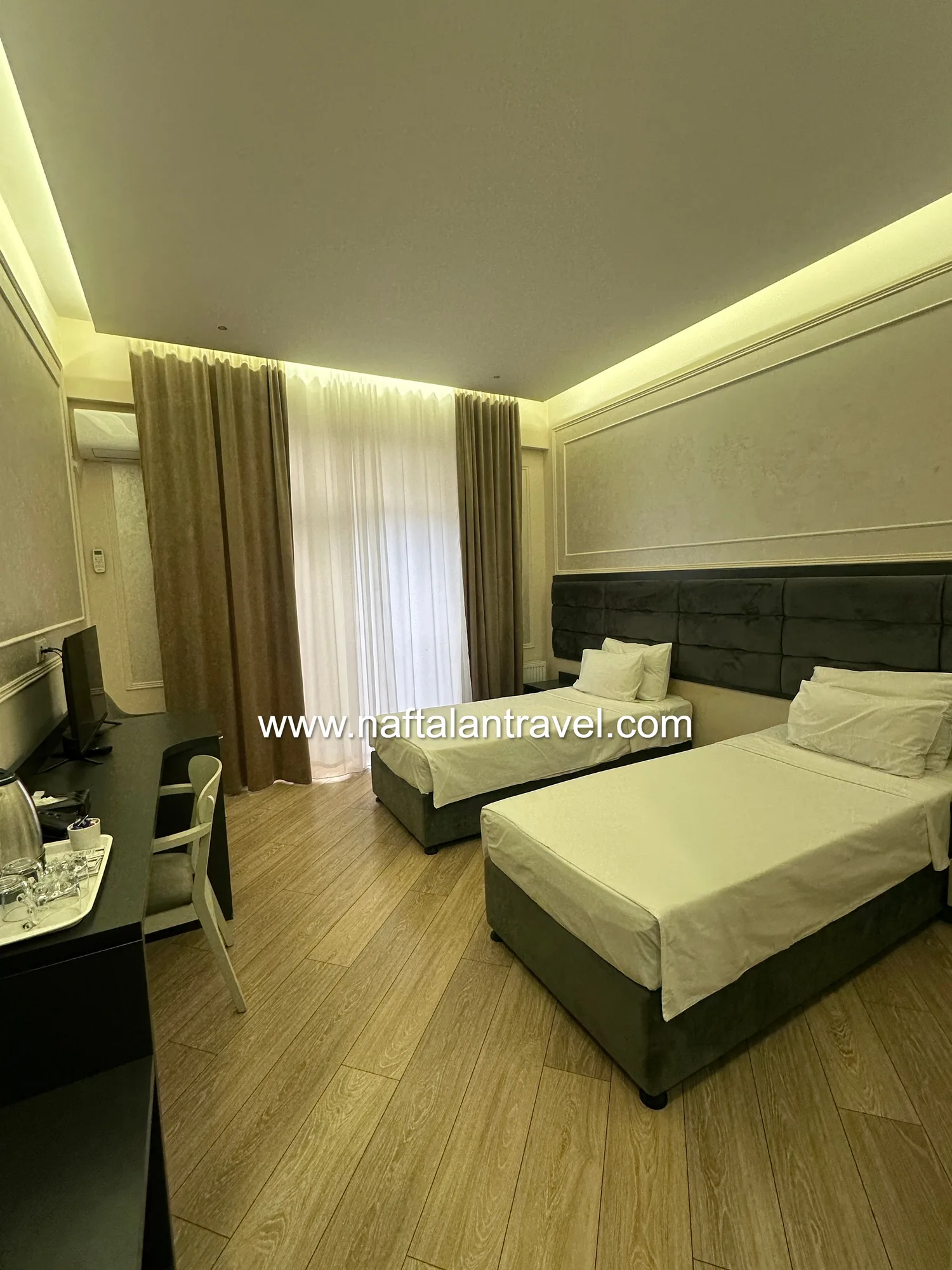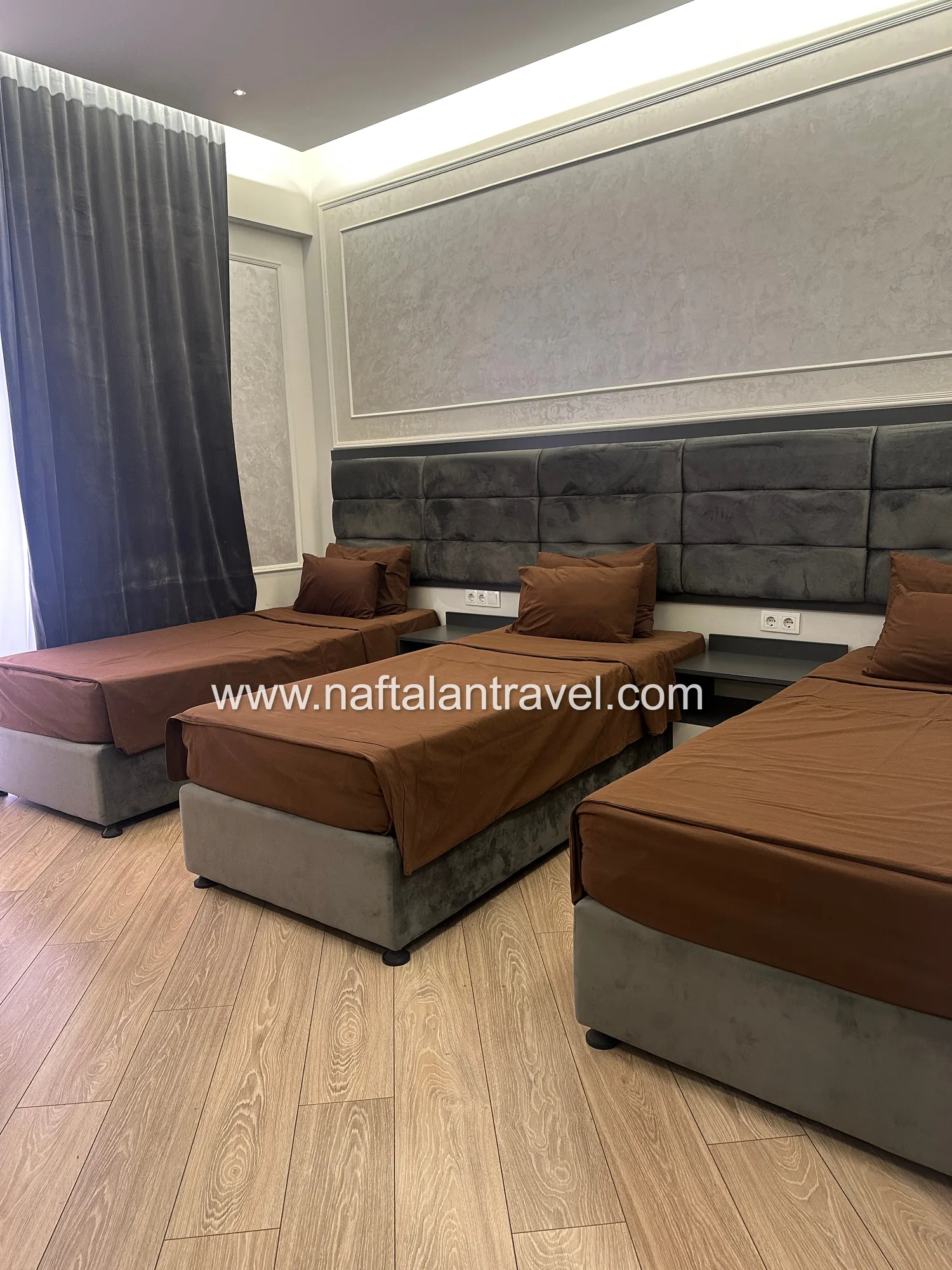 Элегантное оформление, мягкие оттенки и продуманные детали создают гармоничное пространство, где каждый гость может расслабиться и восстановить силы в тишине и красоте Нафталана.