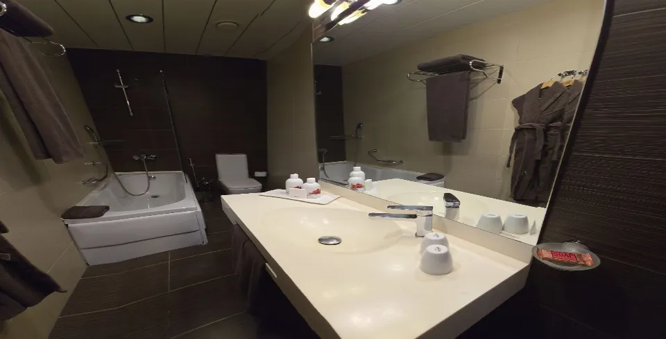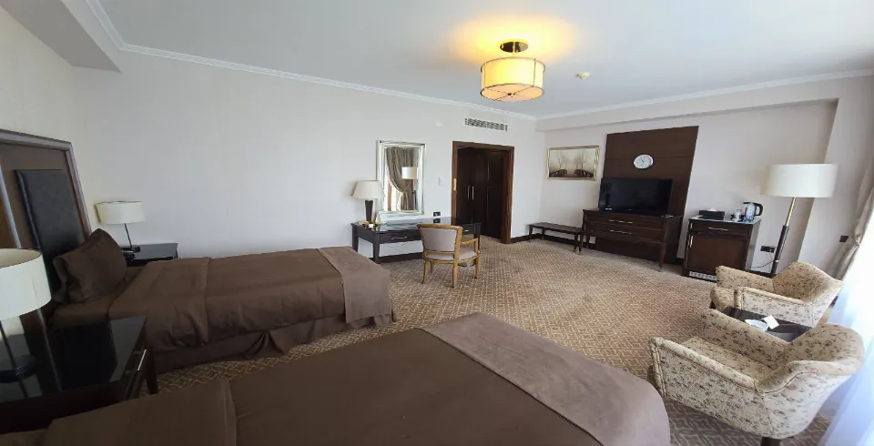 Просторный номер категории Deluxe площадью около 38 м² создан для гостей, ценящих уют и современный стиль. Элегантный интерьер, функциональная мебель и продуманная планировка обеспечивают максимум удобства во время отдыха или деловой поездки в Нафталан.
